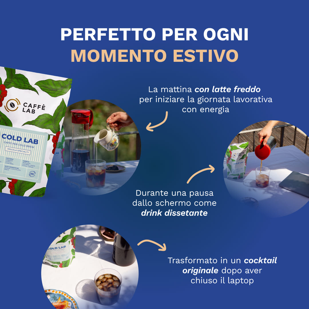 Spesso si pensa al caffè freddo come semplice alternativa al caffè caldo, sacrificando qualità e sapore in favore del solo refrigerio, perdendo il suo valore come esperienza di piacere profondo. Noi di CaffèLab crediamo che la pausa caffè estiva debba essere rigenerante non solo per la caffeina e la freschezza, ma anche per la gioia nel assaporare un prodotto che deriva dalla sua preparazione lenta, che sprigiona un aroma delicato, offrendo un gusto setoso.