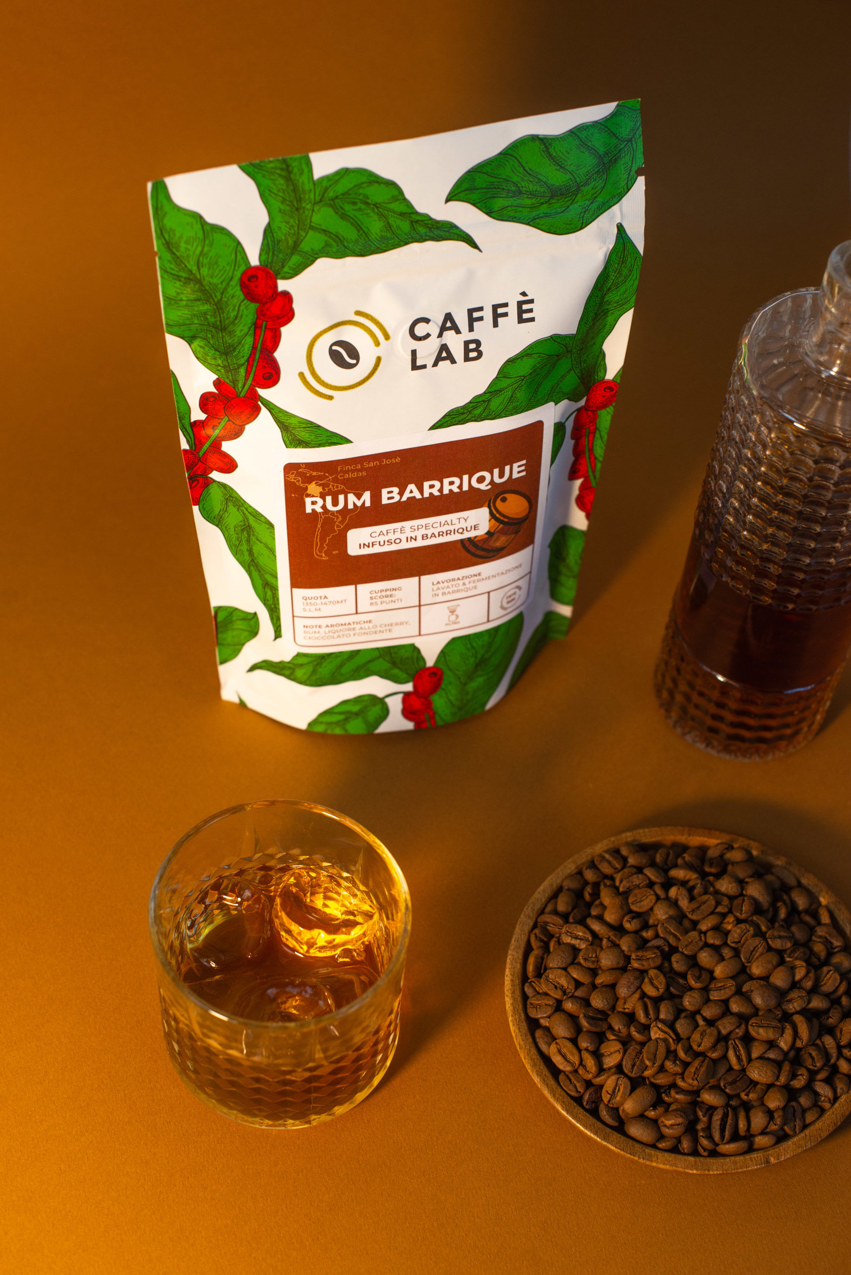 La raccolta è fatta seguendo il picking manuale. Le ciliegie di caffè adatte a questo tipo di processo devono avere un colore violaceo, molto mature. Per questo vengono selezionate durante il secondo e terzo raccolto dell’anno. Una volta spolpate e lavate, vengono messe a fermentare per un tempo massimo di 20 ore e quindi posizionate all’interno del silos. Ottenuta l’umidità desiderata, il caffè viene posizionato su delle Marquesinas per terminare l’asciugatura naturalmente. Il caffè viene quindi selezionato per crivelli, in particolare 17/18, e messo all’interno di barili di Rum che hanno contenuto la cosiddetta tafia del Rum per almeno 8 anni. Il caffè viene lasciato qui per circa 3 mesi. Ogni 30 giorni viene prelevato un campione per le analisi. L’unico obiettivo è ora raggiungere il risultato desiderato: un caffè con l’aroma e il gusto del rum.