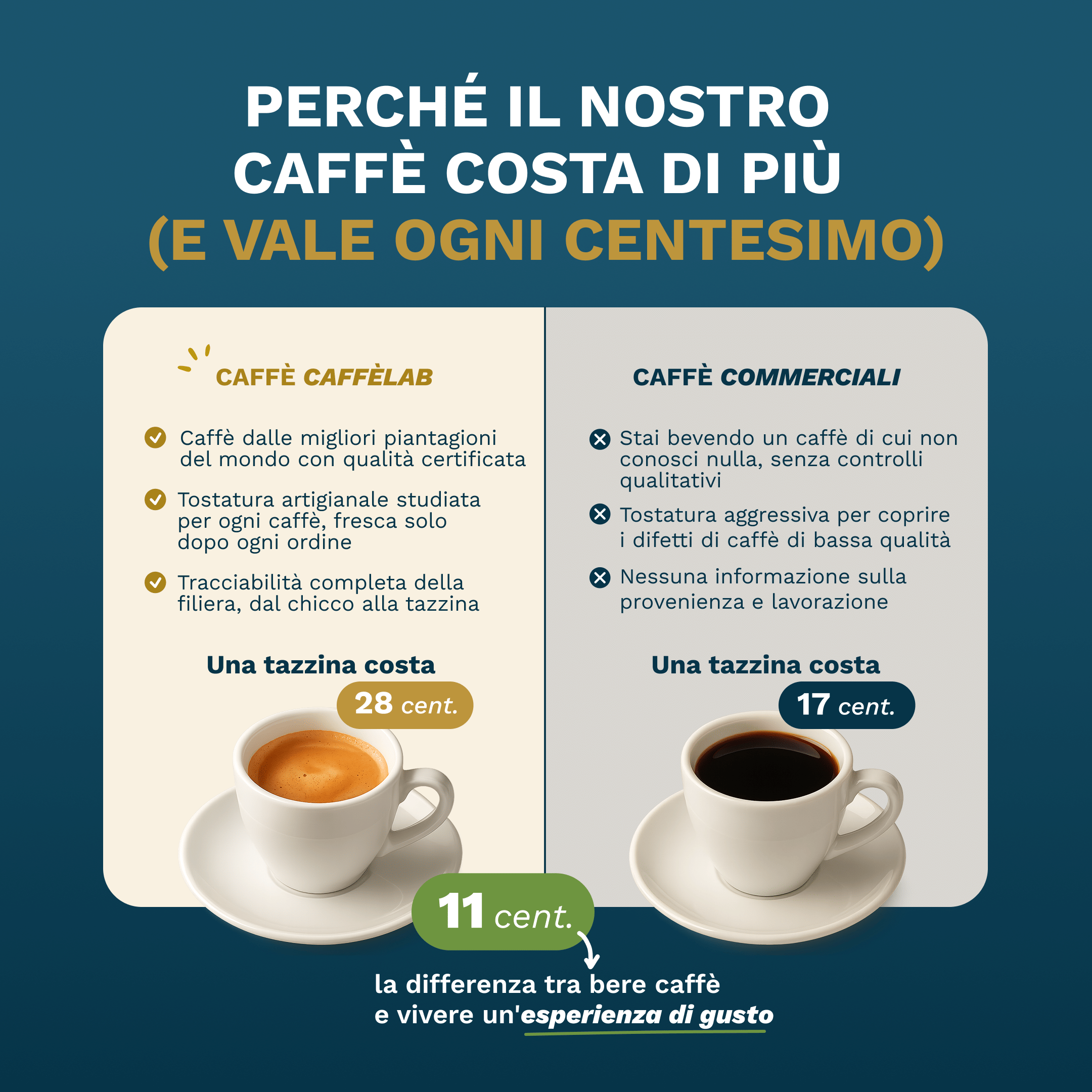 Oggi il caffè viene pensato come semplice fonte di energia o momento di socialità, perdendo il suo valore come esperienza di piacere profondo. Noi di CaffèLab crediamo che la pausa caffè sia rigenerante non solo per la caffeina, ma anche per la gioia che deriva dalla sua preparazione, dall'aroma che sprigiona e dal gusto che offre.