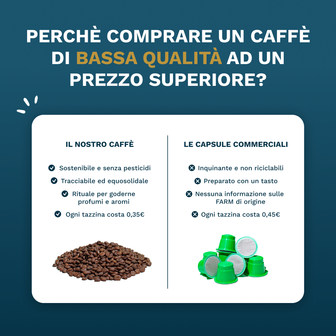 Inoltre, per soddisfare le esigenze industriali, il caffè che bevi di solito è tostato in modo molto aggressivo ad alte temperature, rischiando di bruciare i chicchi e facendo perdere ogni nota aromatica, per poi essere conservato per mesi prima del tuo consumo. Il risultato è un caffè dal gusto piatto e molto amaro.