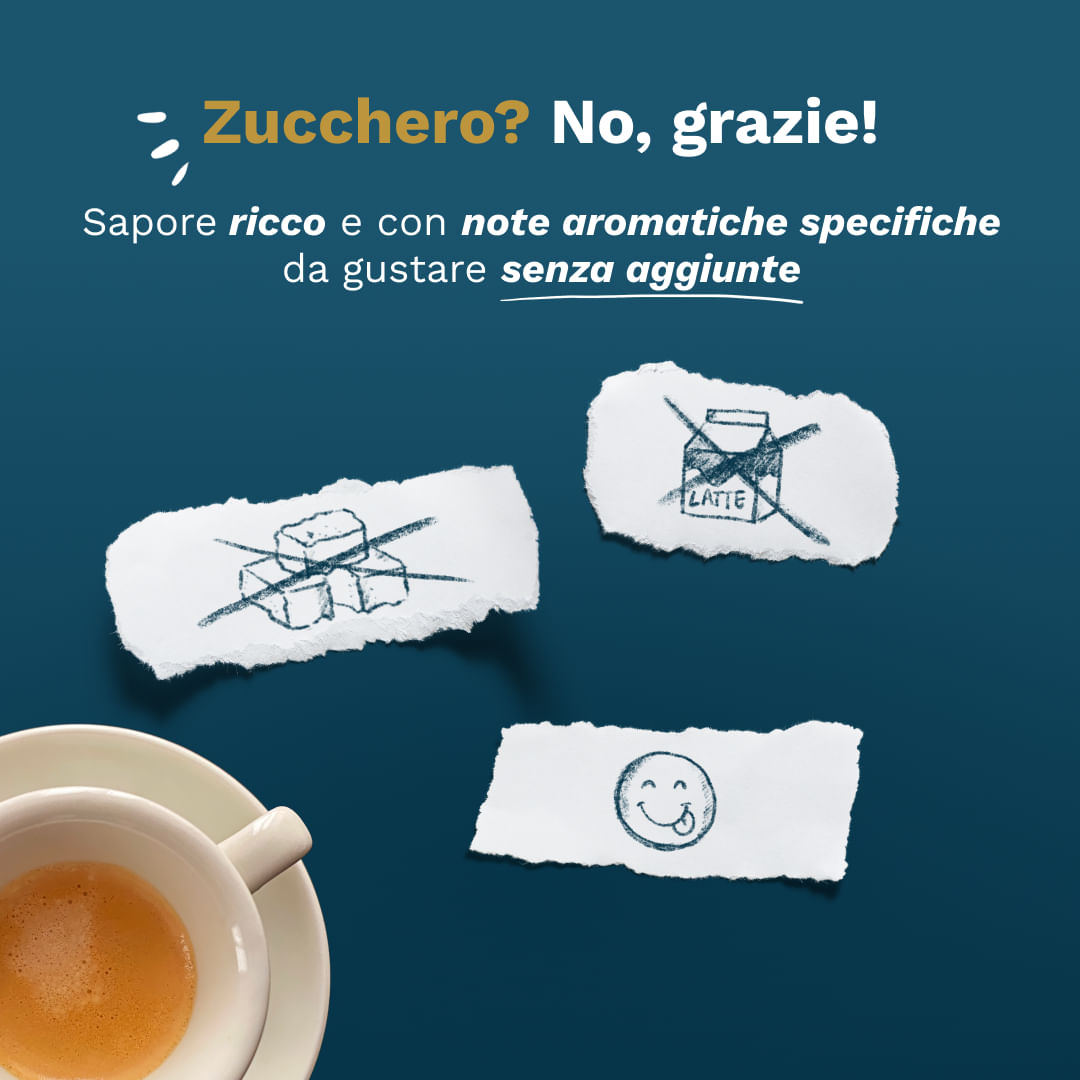 Riscopri il rituale del caffè sorseggiando una tazza ricca di sfumature aromatiche, perfetta da gustare senza bisogno di aggiunte.