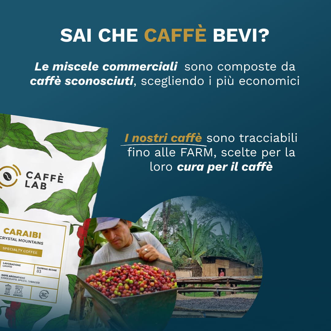 - Caraibi Crystal Mountain- Monorigine Specialty dalle alture caraibiche delle Crystal Mountains, coltivato all’ombra di alberi nativi e lavorato con metodo lavato. Offre un profilo rotondo e bilanciato, con note di tabacco, spezie dolci e cioccolato fondente. Ha ottenuto 83 punti SCA, a conferma della sua qualità superiore. Perfetto in espresso e con la Moka.