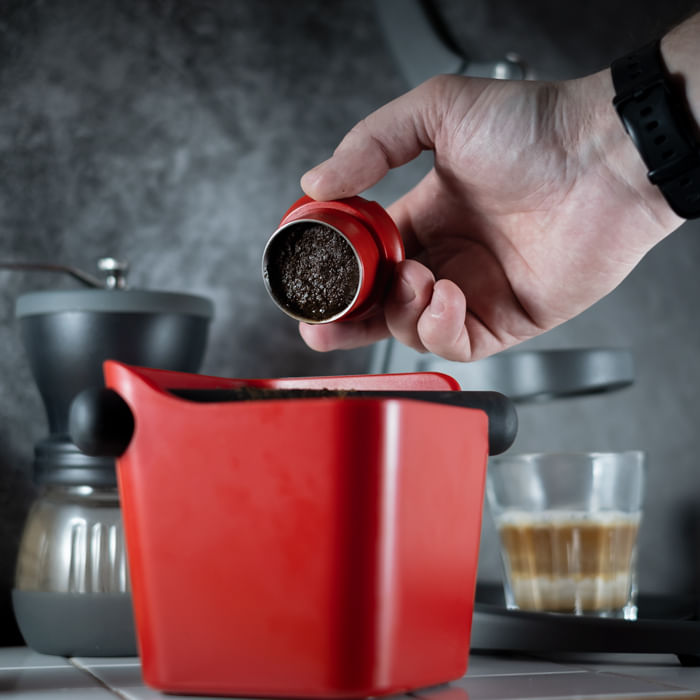 Lo Knock Box della Tubbi (cassetta per sbattere il portafiltro), è di dimensioni contenute per stare in ogni cucina. È dotato di una barra in gomma, che attutisce e permette di non svegliare chi dorme la mattina presto, antiscivolo e facile da pulire. Uno Knock Box casual di colore rosso.