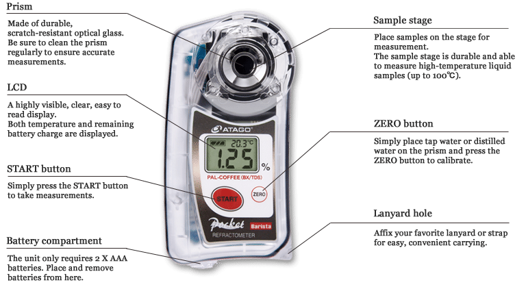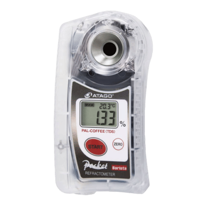 Il rifrattometro è uno strumento digitale che consente di misurare l'indice di rifrazione di un liquido. Nella misurazione scientifica dell'estrazione del caffè questo serve per calcolare con precisione la concentrazione dei solidi disciolti all'interno della bevanda, il TDS.