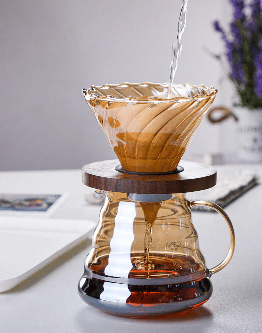 Uno dei più famosi accessori per preparare un caffè filtro manualmente, il V60, che come dice il suo nome non è altro che un cono a V con un angolo di 60°. Uno strumento che può regalare tazze di caffè molto pulite ed esaltare gli aromi dei nostri chicchi in una versione elegantissima in vetro e legno di ulivo