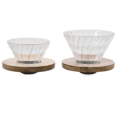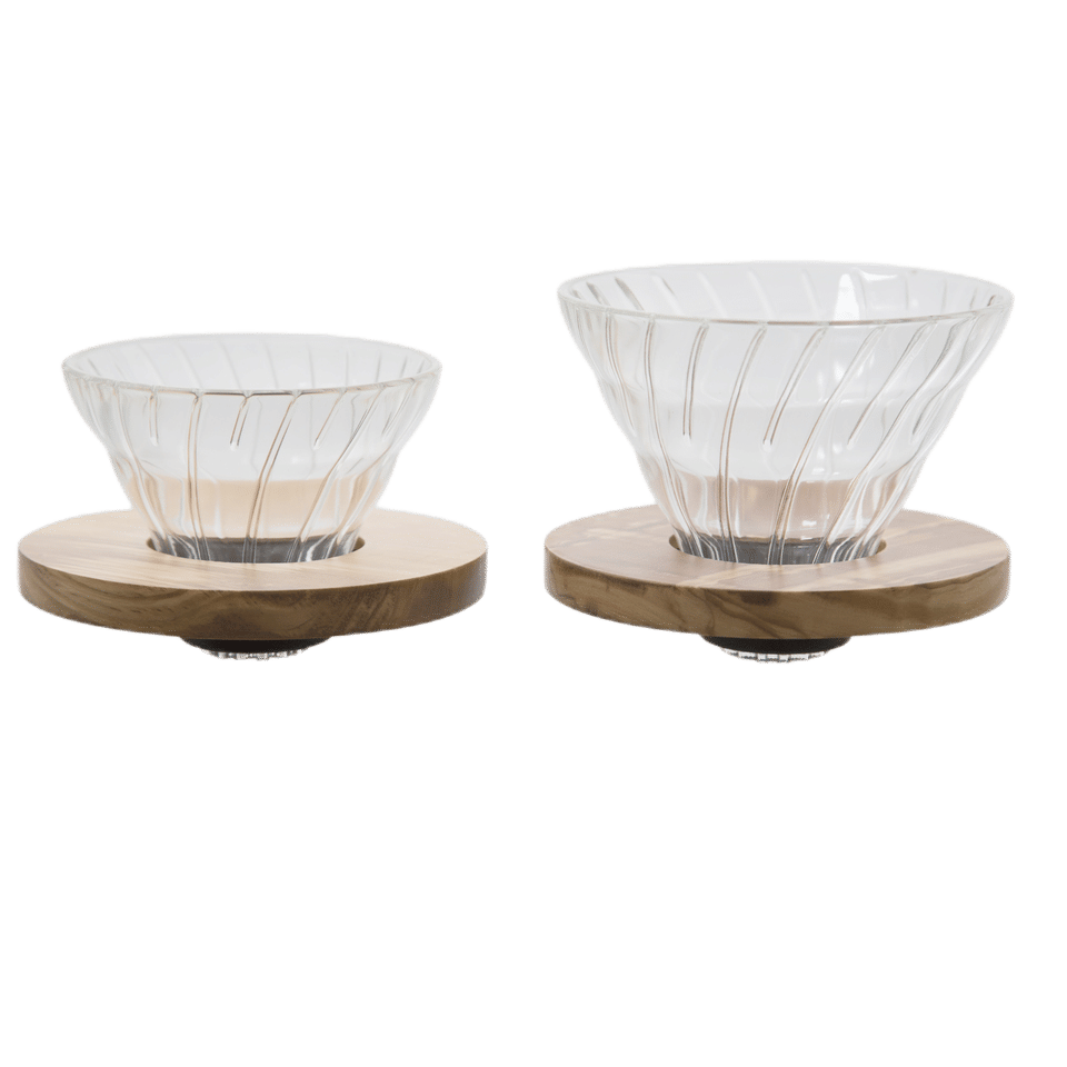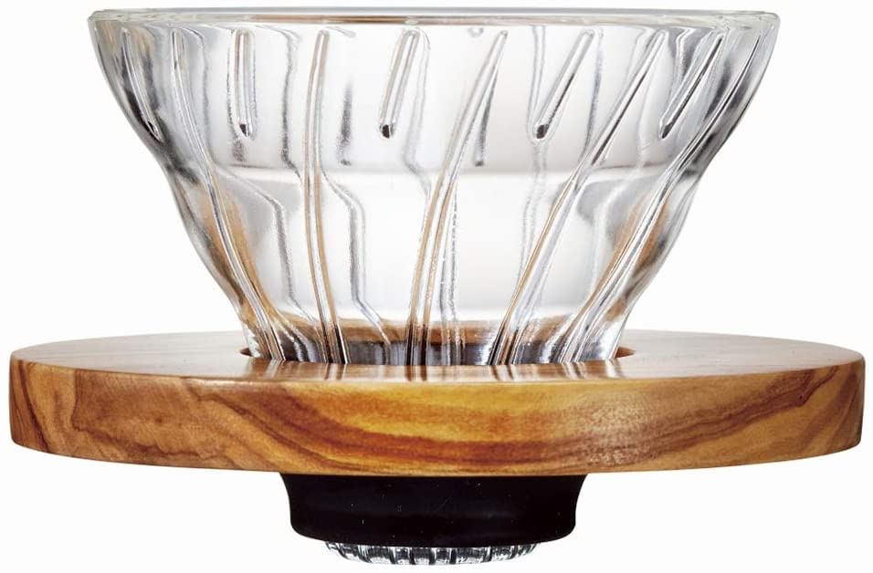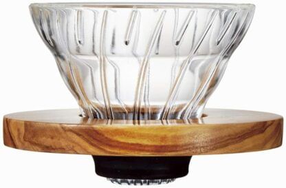 Uno dei più famosi accessori per preparare un caffè filtro manualmente, il V60, che come dice il suo nome non è altro che un cono a V con un angolo di 60°. Uno strumento che può regalare tazze di caffè molto pulite ed esaltare gli aromi dei nostri chicchi in una versione elegantissima in vetro e legno di ulivo